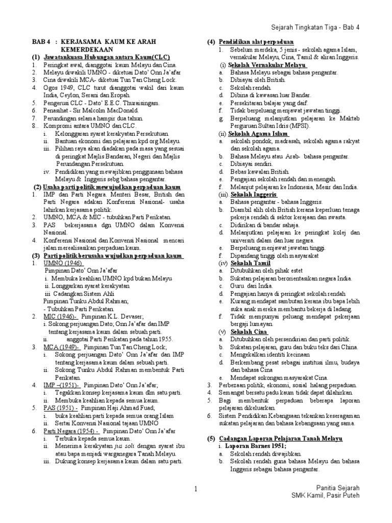 Sila klik link disetiap tajuk untuk mendapatkan nota ringkas setiap bab berkaitan dari 1 hingga 10. SEJARAH KSSM T4-BAB 3 2020 was published by salmiah sulong on 2020-03-24. 31 Nasionalisme di Negara Kita Sebelum Perang Dunia.